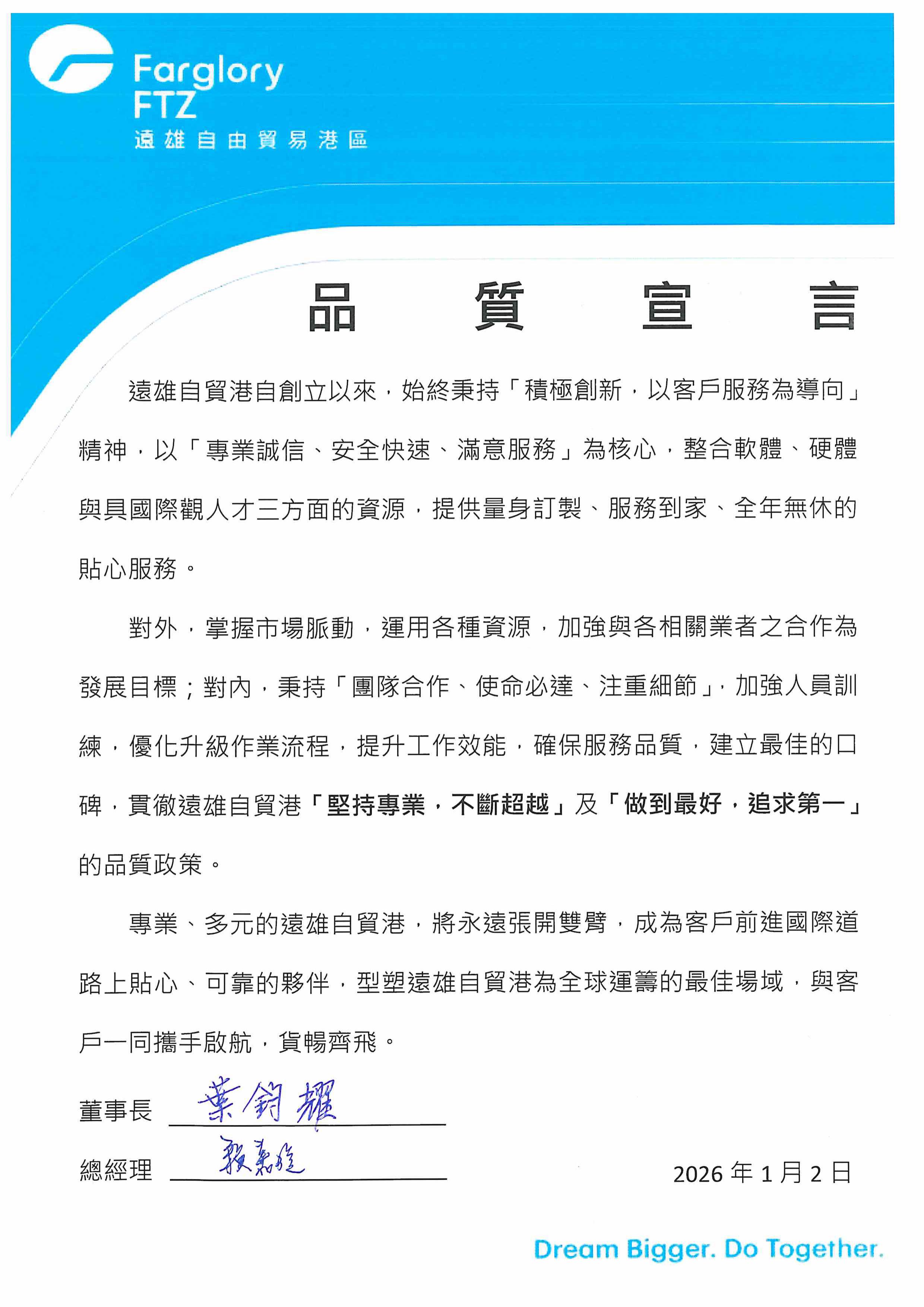 目前以多元化、客製化、效率保證的服務為目標,串連物流、人流、商流、金流、資訊流及境內關外的空運特區規劃培養推向天際的的高效團隊,將遠雄自由貿易港區及遠雄物流,打造為跨越國界、邁向世界的最佳途徑。